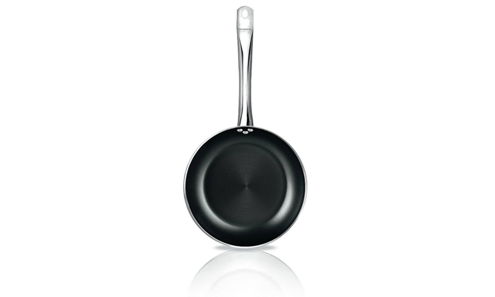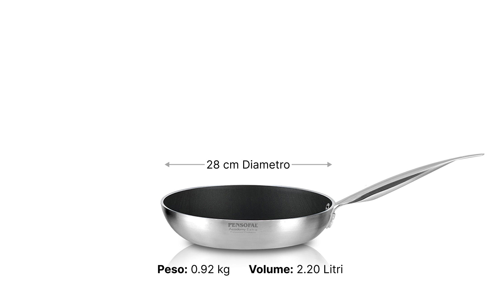 Manico della padella in alluminio realizzato completamente in acciaio inossidabile. Doppio fondo brevettato da Pensofal a superficie piana rende la padella compatibile con tutti i piani di cottura incluso induzione.