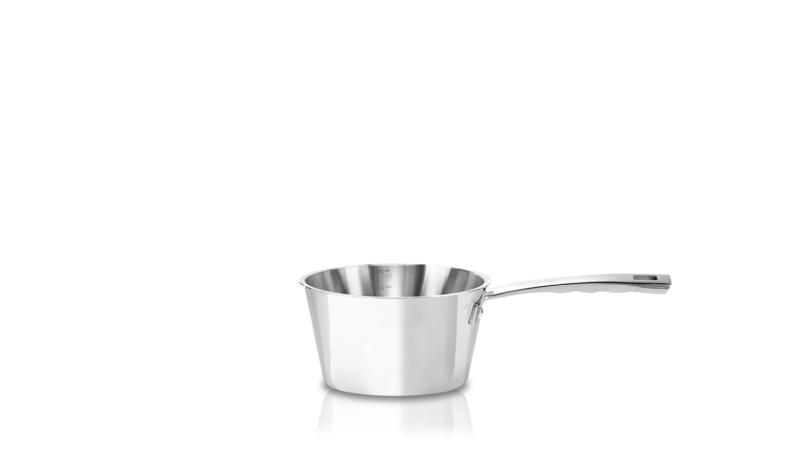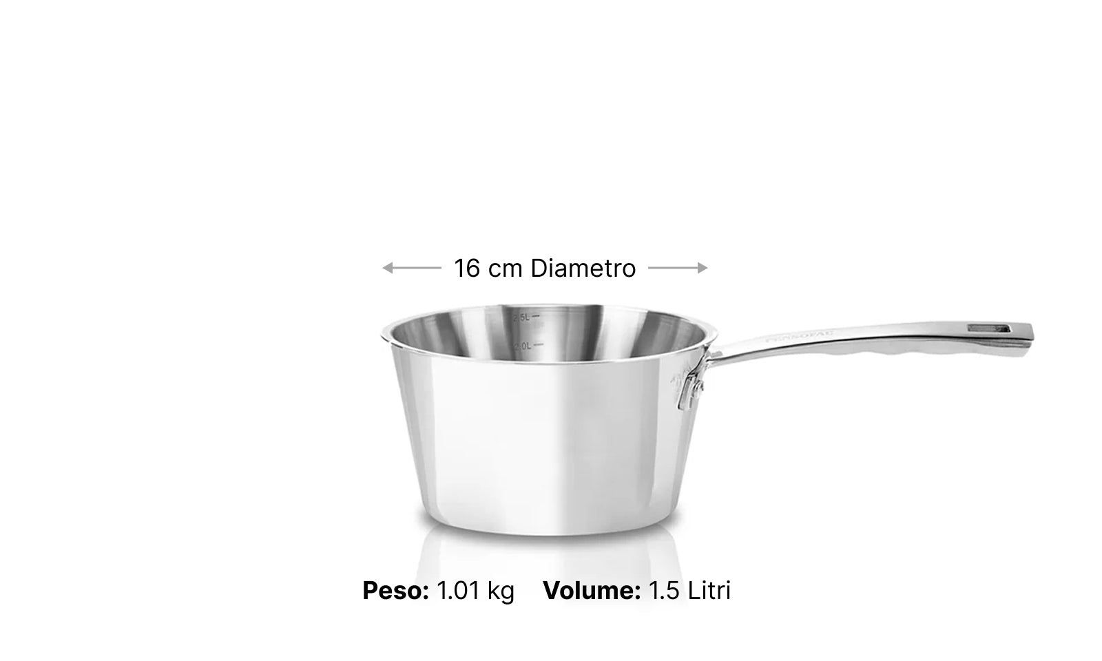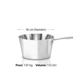 La Casseruola un manico con coperchio in acciaio inox della collezione Royal, grazie alla particolare forma conica  favorisce l'amalgama degli ingredienti.